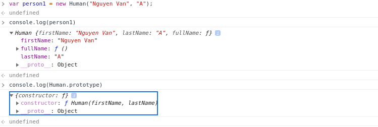 Nó chỉ ra rằng person1 có thuộc tính __proto__ và Human.prototype trỏ đến cùng một object