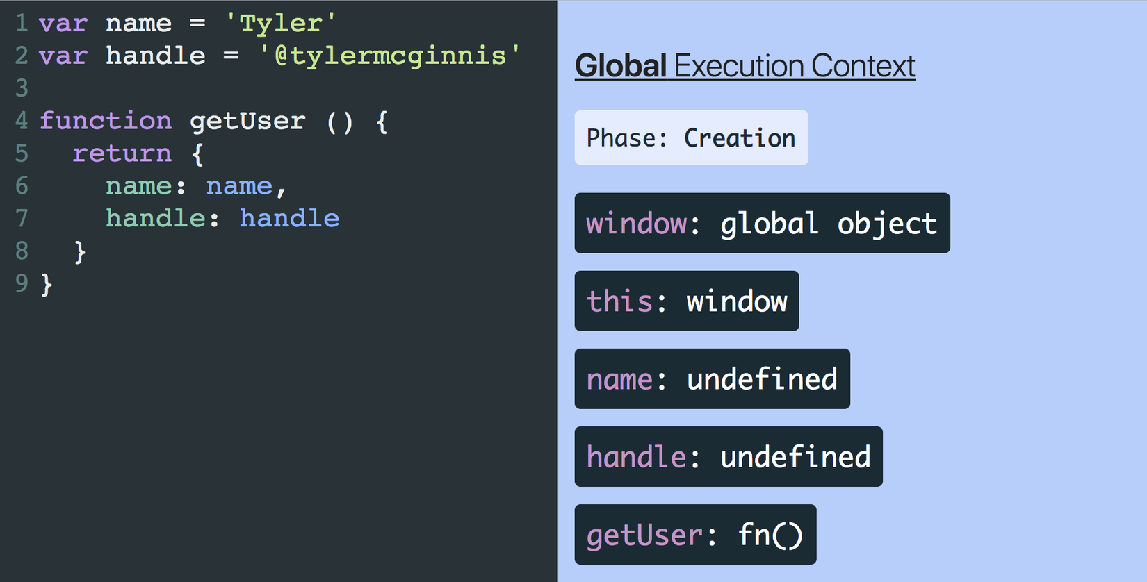 6có vẻ rất Simple Love, nhưng có nhiều vấn đề ở đây. Đầu tiên ta khai báo một variable trong Global Execution Context có tên làb, ngay khi được Creation thì nó sẽ được gán giá trị làundefined. ( chưa hiểu saoundefinedthì kéo lên trên đọc nhé các bạn ). - Vẫn là dòng