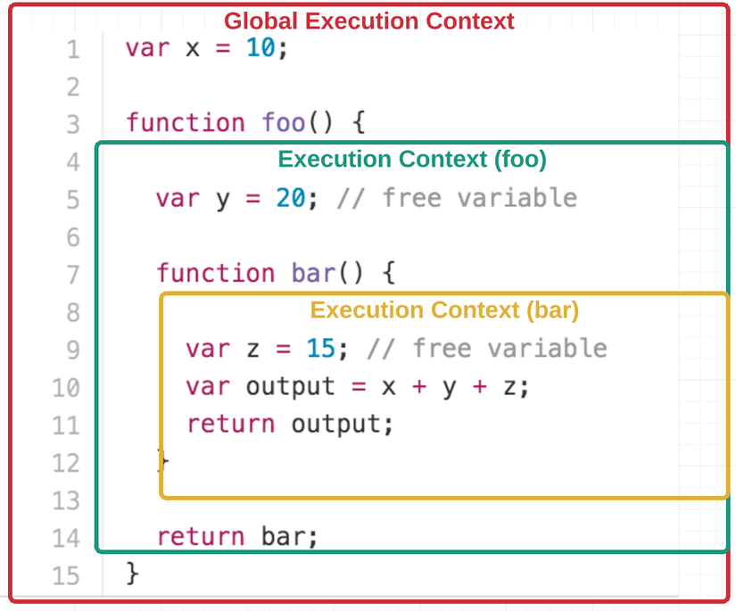 Câu chuyện ở đây là gì, chúng ta có những variable trong các Function Execution Context và Global Execution Context, một điều rắc rối của JavaScript là làm thế nào là làm sao nó kiếm được variable nó cần, nếu nó không tìm được trong Function Execution Context của nó, nó sẽ tìm đến Calling Context, và nếu ở đó nó không tìm thấy nữa thì nó tiếp tục tìm ở Calling Context của Calling Context đó, Cứ lặp lại như thế cho đến khi gặp Global Execution Context, và nếu không gặp được variable cần tìm thì value được trả về cho biến đó là undefined. Để hiểu rõ chúng ta hãy theo dõi ví dụ trên. Nếu bạn đã biết về scope thì có thể bỏ quan phần này.