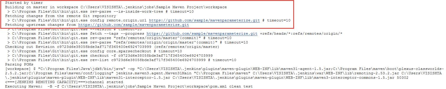 Bây giờ theo cấu hình ở trên, bản build sẽ kích hoạt cứ sau 5 phút. Khi quá trình xây dựng được kích hoạt, bạn có thể kiểm tra đầu ra console output, nó sẽ hiển thị cho bạn như hình ảnh bên dưới: