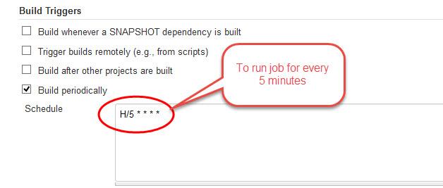 Builds Periodically : sẽ kích hoạt các bản builds theo lịch trình (Nếu chúng ta chỉ định H / 5 * * * *, cứ sau 5 phút) ngay cả khi bạn không thay đổi gì. Pull SCM sẽ kiểm tra các thay đổi trước khi kích hoạt bất kỳ bản build nào, nếu có thay đổi cho phiên bản trước thì chỉ có bản build sẽ được kích hoạt.