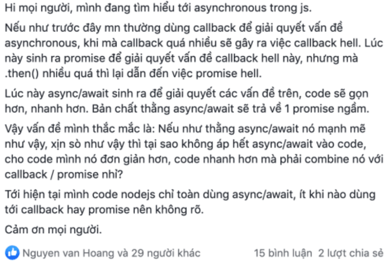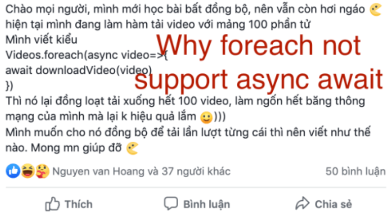 Đến đây thì OK rồi phải không các bạn, chúng ta đã lý giải được vì sao forEach lại không support async/await rồi nhé. Thế thì làm thế nào sử dụng được async/await trong forEach thì... mình đợi comment của các bạn nhé