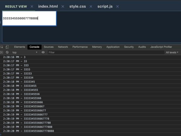 Kết quả thì có khác đôi chút nhé các bạn. Ở đây bạn nhìn kỹ ở đây thì bán sẽ thấy, cứ 1s thì sự kiện được kích hoạt, và cứ thế cho đến khi người dùng không còn nhập tìm kiếm nữa.