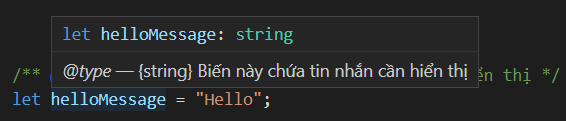 Ta có thể thấy hàm printMessage có thể nhận đầu vào msg là bất cứ kiểu dữ liệu gì, nhưng nếu chúng ta muốn cho người khác biết rằng hàm printMessage chỉ nhận msg là kiểu dữ liệu string ta có thể khai báo nó bằng JSDoc. Để viết JSDoc ta cần viết trong cặp dấu /** */: