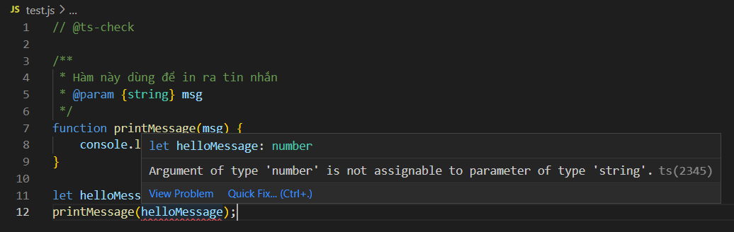Lúc đó chúng ta cần đến type-checking được tích hợp sẵn vào VSCode để giúp thể hiện lỗi lên text-editor khi chúng ta sử dụng sai kiểu dữ liệu. Để sử dụng nó ta cần thêm // @ts-check vào đầu file: