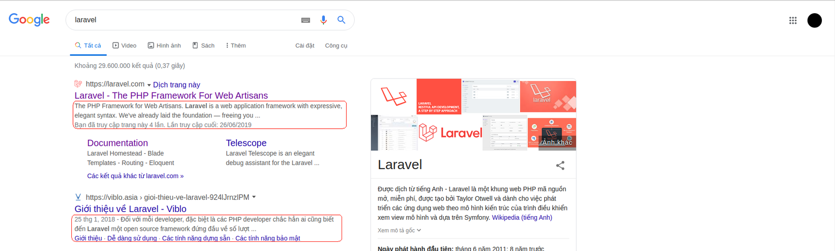 Title và description ở trang kết quả tìm kiếm: khi tìm kiếm trên một