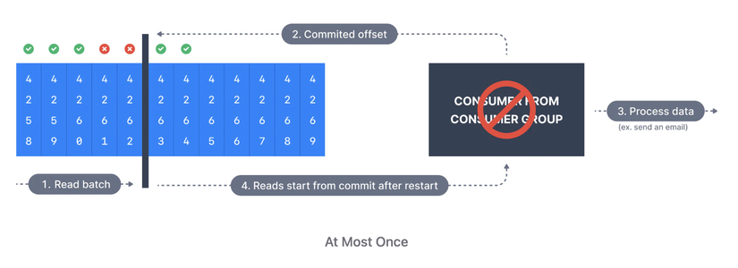 offsetssẽ đượccommitsau khi message được nhận, nếu xảy ra lỗi xử lý, message sẽ bị mất. - At least once: