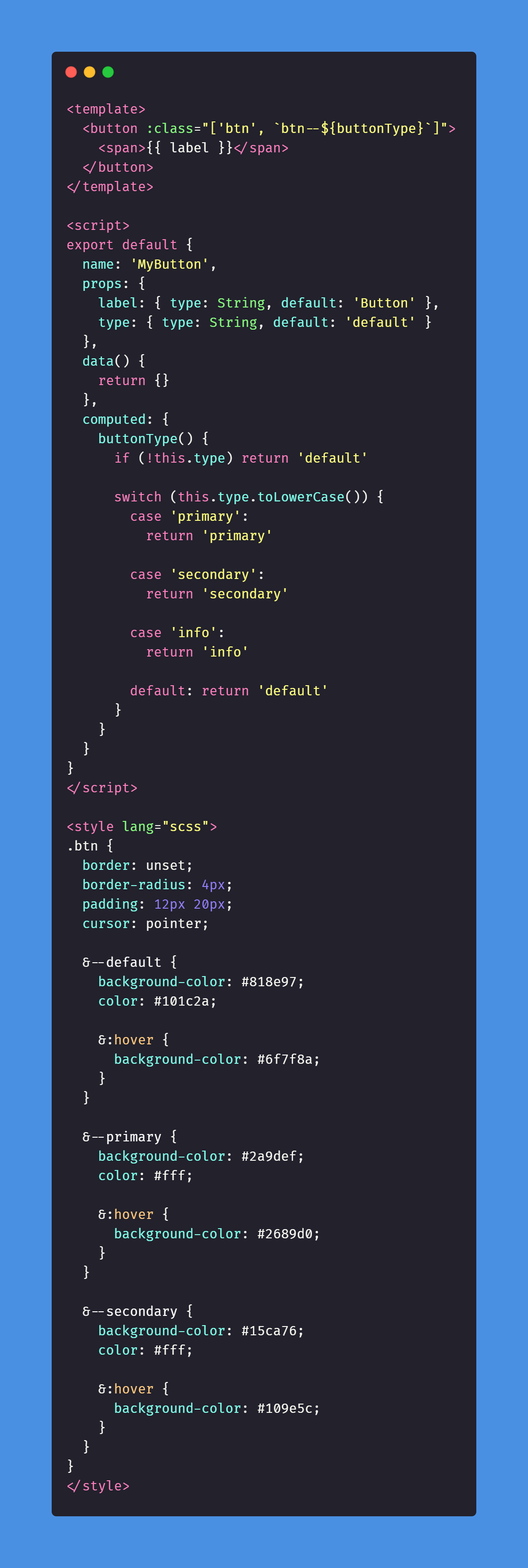 Bài toán: giả sử trong ứng dụng của bạn có rất nhiều button khi đó sẽ có rất nhiều dạng button có kích thước, màu sắc, hình dạng khác nhau. Khi đó chúng ta sẽ thiết kế 1 component có tên là Button (điều này khá giống với các bộ component kit mà bạn thường dùng ví dụ như ant, material...)