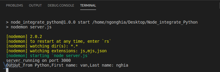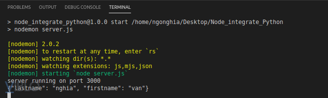package.json// package.json { "name": "node_integrate_python", "version": "1.0.0", "description": "", "main": "index.js", "scripts": { "start": "nodemon server.js", "test": "echo \"Error: no test specified\" && exit 1" }, "keywords": [], "author": "", "license": "ISC", "dependencies": { "express": "^4.17.1", "nodemon": "^2.0.2" } }Hãy thử chạy project trước khi tiếp tục