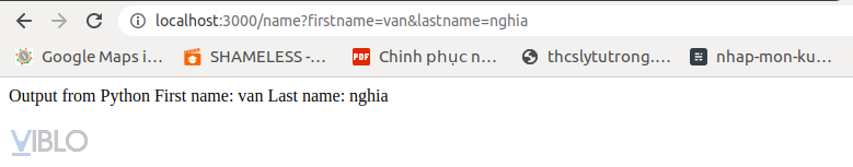 // server.js ... app.get('/name', callName); function callName(req, res) { var spawn = require('child_process').spawn; // E.g : http://localhost:3000/name?firstname=van&lastname=nghia var process = spawn('python', [ './process.py', req.query.firstname, req.query.lastname ]); process.stdout.on('data', function(data) { console.log(data.toString()); res.send(data.toString()); }); }Hàm được sử dụng để tương tác giữa nodejs và python ở đây là child_process.spawn() theo như định nghĩa thì :