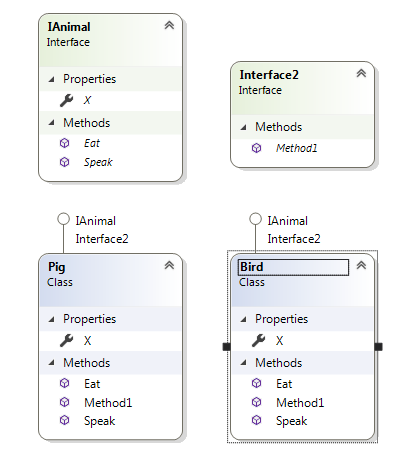 Ở demo trên mình tạo ra 2 interface IAnimal và Interface2 tiếp theo là 2 class Pig,Bird implement 2 interface.