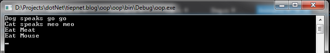 Abstract class Animal có 2 method là abstract method(Speak) và method thường(Eat), class Dog và Cat kế thừa lại abstract method