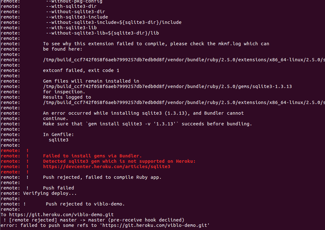 Lỗi này thì cơ bản đã quá rõ ràng. Do heroku không hỗ trợ sqlite làm database cho ứng dụng, trong khi file Gemfile của bạn lại đang sử dụng nó ( Đặt nằm ngoài group :development). Cách giải quyết đơn giản là bạn hãy mở file gemfile lên, tìm và di chuyển nó vào group development.