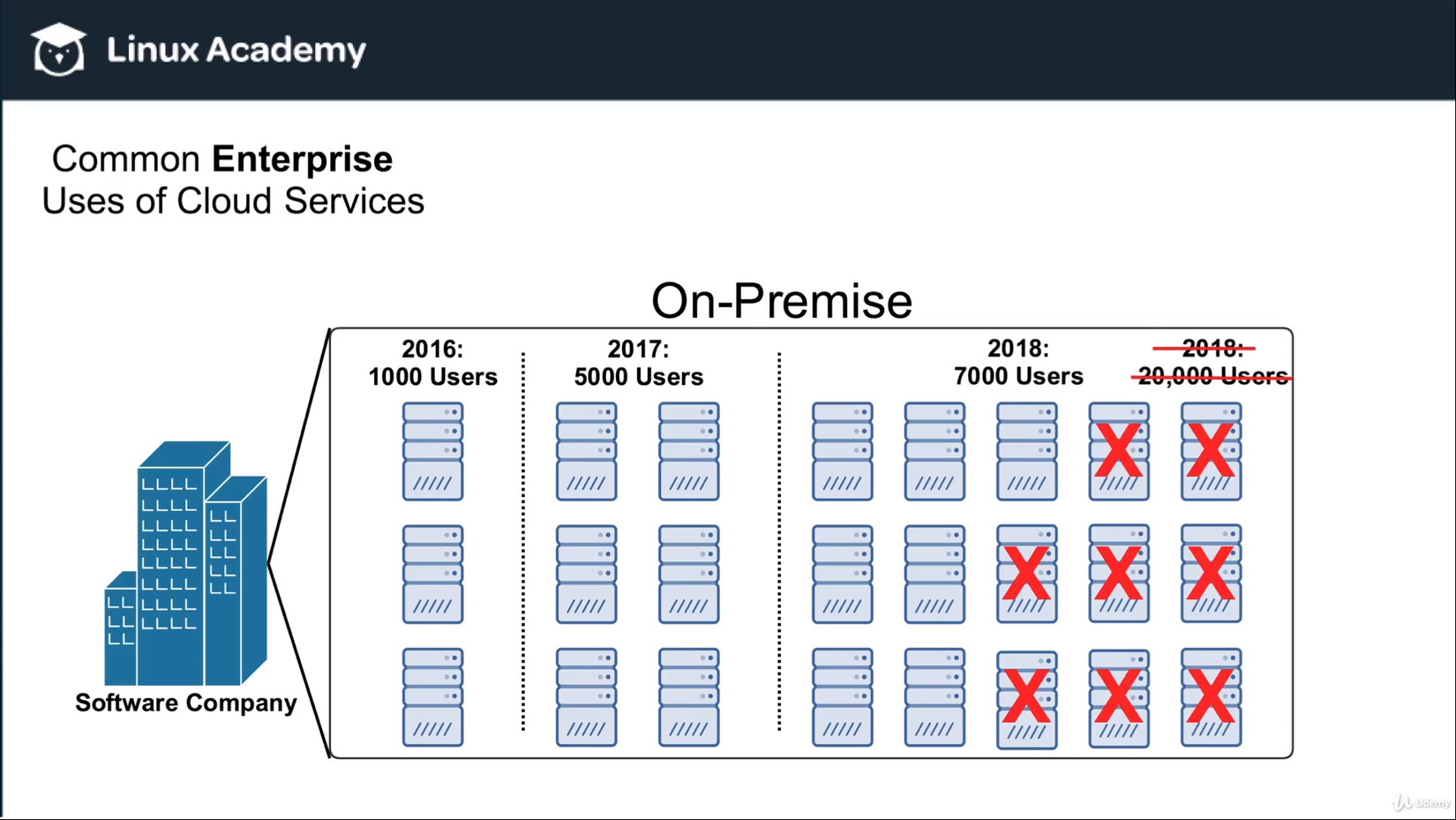 Sau đó, giả sử ước tính của công ty là chính xác, tức là công ty phảt triển tốt và công ty tiếp tục ước tính tới năm 2018 lượng user sẽ tăng lên tới 20,000. Lúc này, công ty sẽ cần phải có thêm 12 server và công ty lại phải tiếp tục chuẩn bị chỗ trống để đặt thêm server và tiếp tục bỏ tiền ra để mua thêm server rồi tiếp tục quá trình order, đợi hàng, cài đặt.