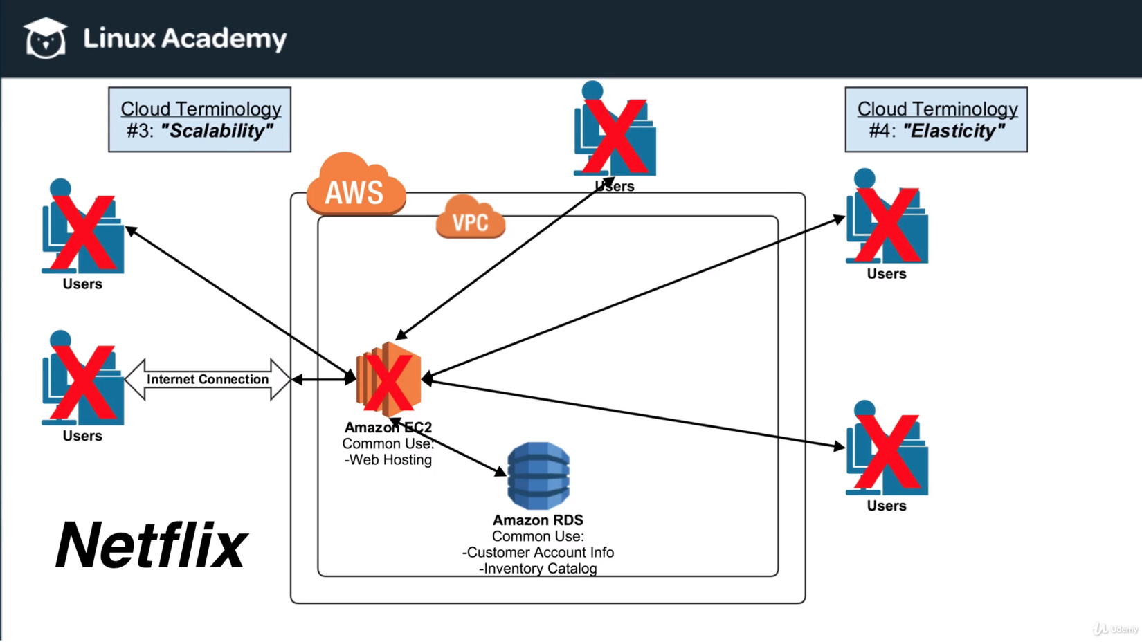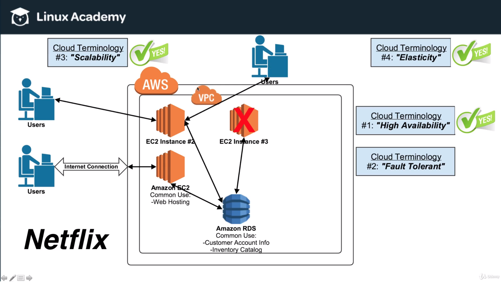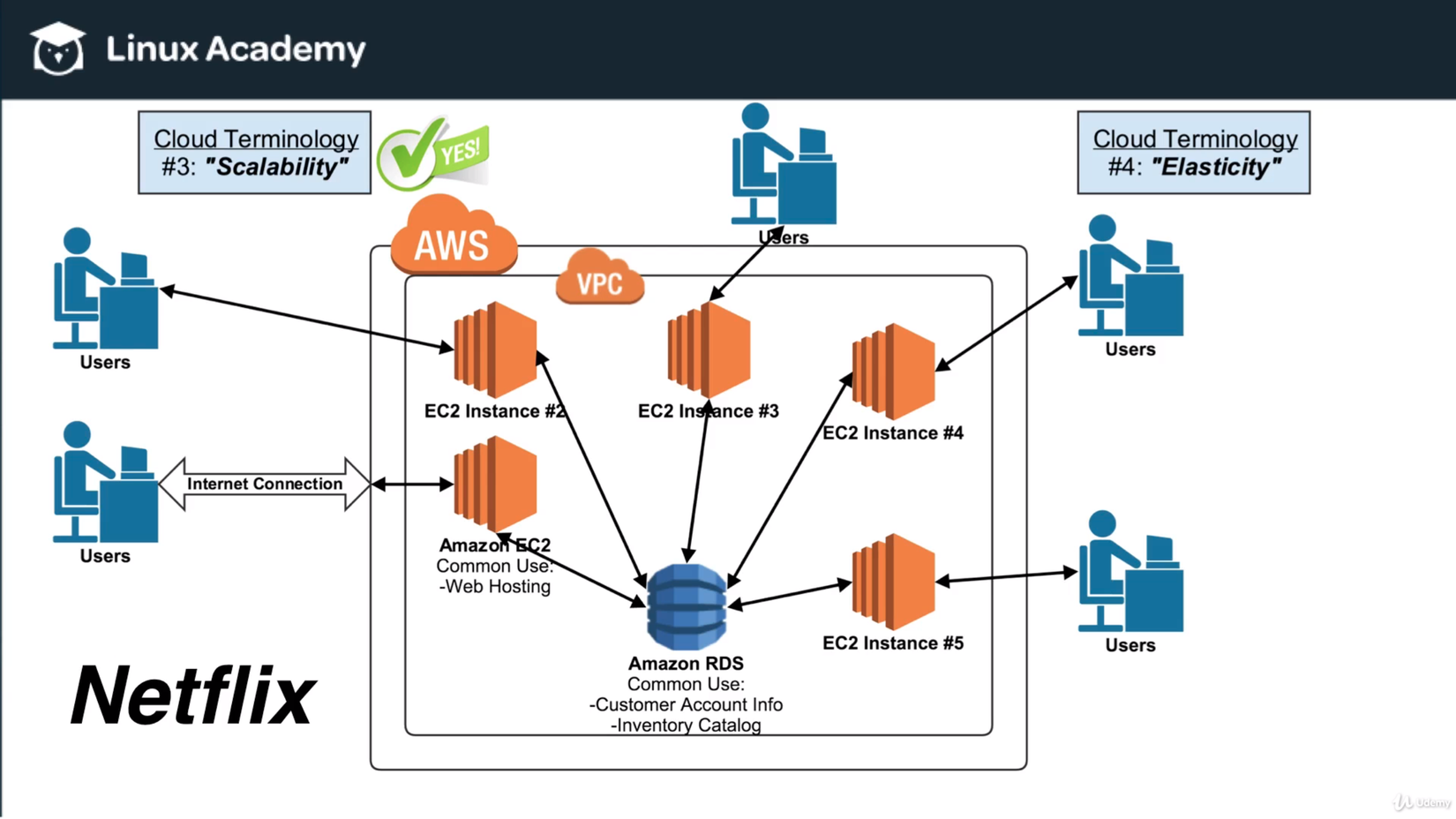 Vậy là tính Scalability đã được thể hiện. Còn Elasticity thì sao? Giả sử đến 11h, 12h, 1h sáng, lượng user truy cập giảm xuống. Lúc này không còn ai sử dụng instance #4 và #5 nữa, khí đó AWS chỉ đơn giản là loại chúng ra khỏi VPC và account của Netflix, nghĩa là Netflix sẽ không phải trả phí cho các instance này nữa.