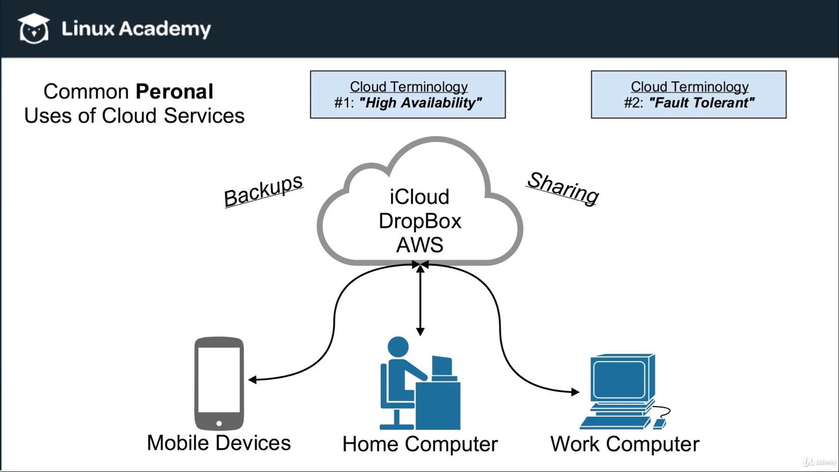 - #2 - "Fault Tolerant" (tính chấp nhận lỗi): nếu bạn có một file chỉ ở trên máy tính tại nhà của mình và ổ cứng của máy tính tại nhà của bạn bị hỏng thì file đó sẽ bị mất vĩnh viễn. Nhưng nếu bạn lưu file đó trên cloud và nó được sao lưu trên nhiều service thì dù file đó có bị lỗi hoặc server cloud mà bạn đang truy cập file đó bị lỗi thì sẽ luôn có bản sao khác, nghĩa là dù hệ thống có bị lỗi thì bạn vẫn có khả năng lấy lại được file đó.