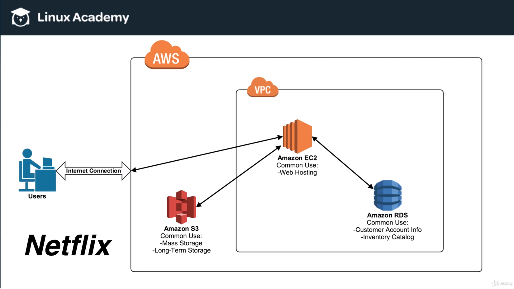 Khi một tập phim trên Netflix được ấn play thì các dòng code của Netflix sẽ tới S3 và tìm đúng tập phim đó và kéo file video về EC2 và EC2 sẽ mã hóa hoặc chuyển mã file hoặc data đó để có thể gửi nó đi qua Internet tới thiết bị của user và user có thể xem được nó. Việc mã hóa hoặc chuyển mã video là một quá trình rất nặng về xử lí do đó cần có một thứ như EC2 để thực hiện được công việc này.