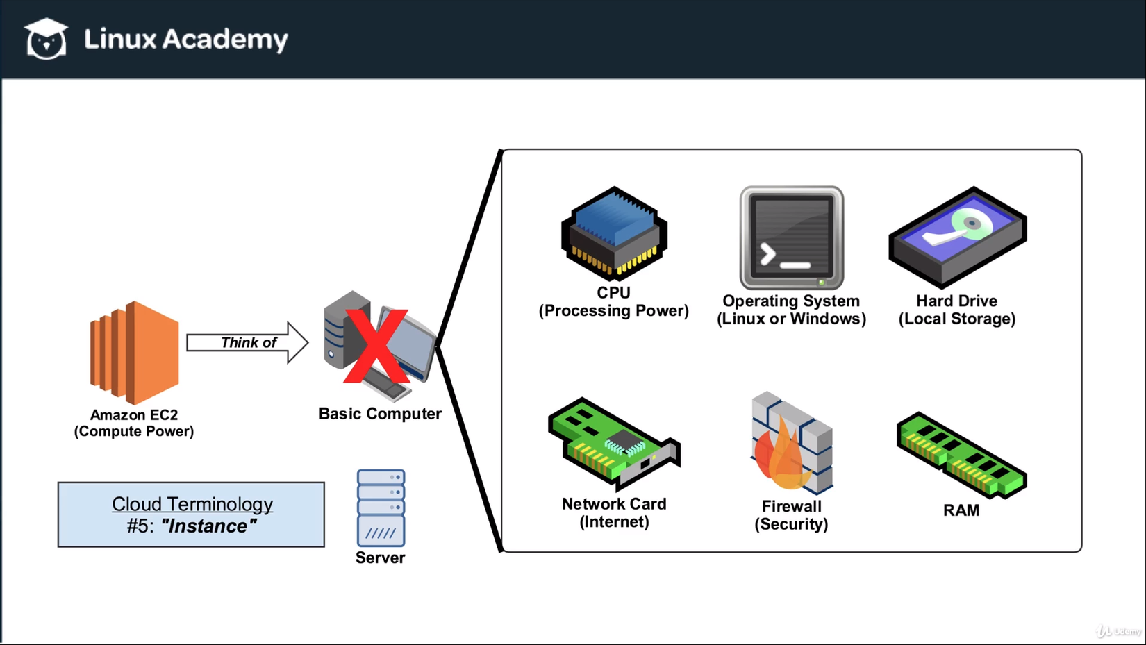 Tuy nhiên, trong AWS thì một cách chính xác hơn, chúng ta phải coi EC2 tương đương với một máy chủ (server computer), bởi vì nhìn chung AWS được sử dụng bởi các doanh nghiệp, và thường thì họ muốn sử dụng sức mạnh xử lý của các EC2 trong việc làm server.