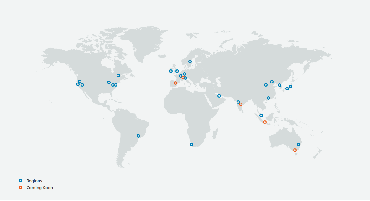 Bản đồ trên thể hiện vị trí của tất cả các AWS region. Vậy AWS region là gì? Mỗi region là một khu vực địa lý tập hợp các availability zone và data center của AWS. Bạn có thắc mắc là tại sao lại có nhiều region rải rác trên khắp thế giới như vậy không?