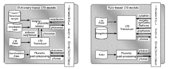 Giải pháp phiên âm dựa trên từ điển bao gồm việc lưu trữ tối đa lượng kiến thức âm vị học vào một từ điển. Sau khi thu được bản phiên âm đầu tiên của mỗi từ, một số quá trình xử lý ngữ âm thường được áp dụng với mục đích tính toán hiện tượng làm mịn. Cách tiếp cận này đã được hệ thống MITTALK tuân theo ngay từ ngày đầu tiên ra đời. Một từ điển lên đến 12.000 hình vị bao phủ khoảng 95% các từ đầu vào. Hệ thống TTS của AT&T BellLaboratories cũng tuân theo nguyên tắc tương tự, với từ điển hình vị tăng lên đến 43.000 hình vị.
