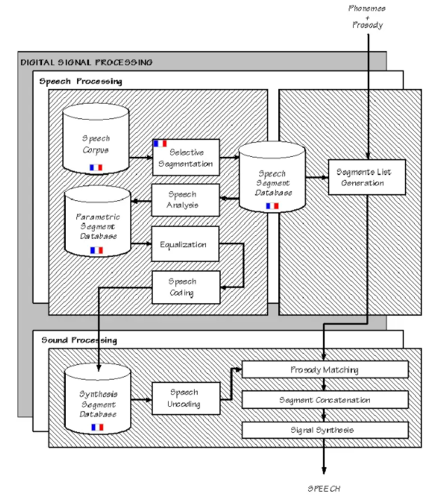 Trong khi tổng hợp giọng nói, bộ tổng hợp ghép nối tạo ra một chuỗi các phân đoạn được nối, được truy xuất từ cơ sở dữ liệu mẫu giọng nói của nó. Ưu điểm của các phân đoạn được điều chỉnh để phù hợp với các giá trị được suy ra từ đầu ra của module xử lý ngôn ngữ tự nhiên.