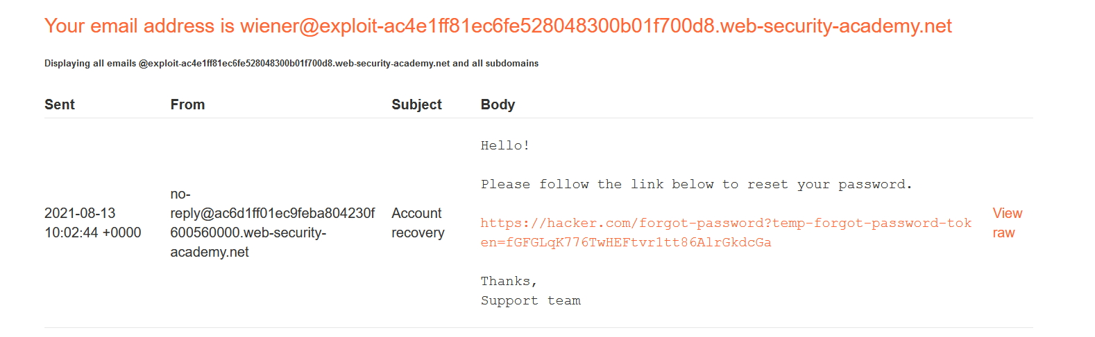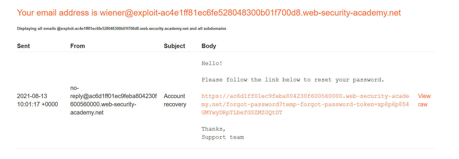 Lặp lại bước quên mật khẩu ban đầu để nhận liên kết đặt lại mật khẩu. Vào phần Email client để lấy liên kết, thay thế temp-forgot-password-token bằng mã ta vừa lấy được từAccess Log: