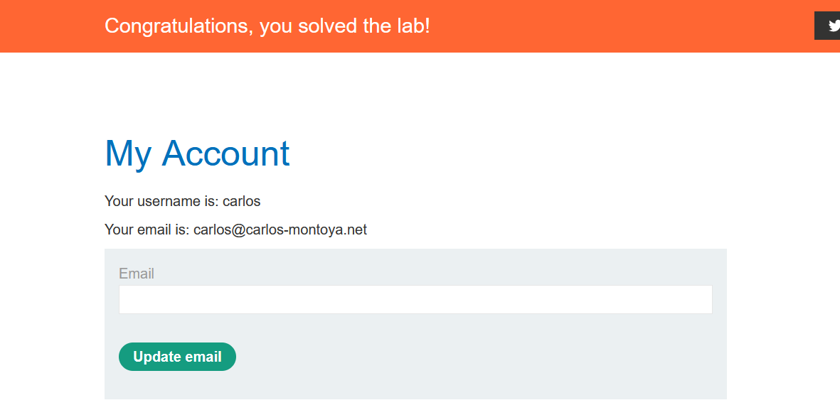 Liên kết sẽ đưa ta đến giao diện đổi mật khẩu của người dùng Carlos. Thay đổi mật khẩu của Carlos, sau đó đăng nhập và giải quyết lab: