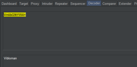 Giải mã b64 bằng chức năng decoder trong burp suite ta được username người dùng là Vibloman. Hacker có thể lợi dụng điều này để khai thác nhằm gửi yêu cầu đặt mật khẩu của nạn nhân về email mà hacker nắm giữ.