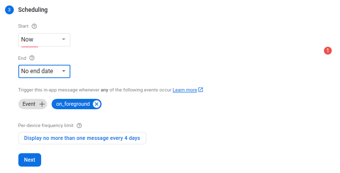 Frequency Limit: Tần số message được xuất hiện trong 1 ngày. Theo mặc định thì 1 ngày chỉ 1 message