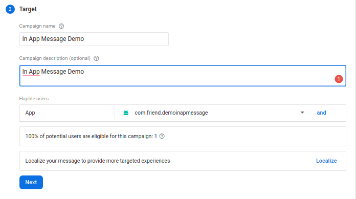 Target app and other conditions: Xác định điều kiện mà tất cả user nhìn thấy message