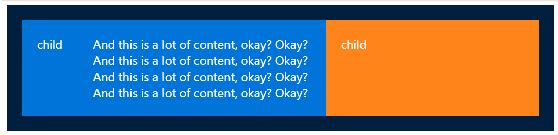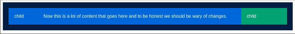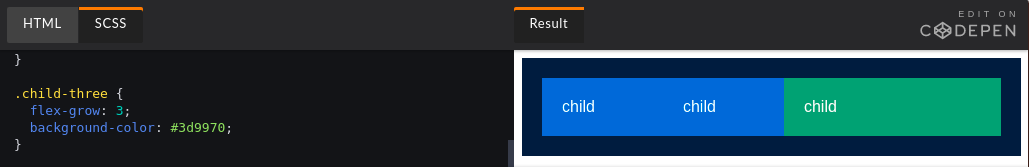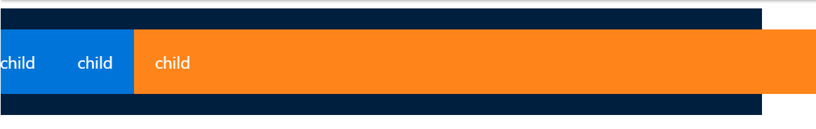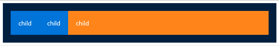 Trong ví dụ trên, 2 phần tử con đầu tiên sẽ chiếm phần không gian bằng nhau, trong khi đó phần tử con thứ 3 to gấp 3 lần các phần tử khác. Tuy nhiên tất cả vẫn phụ thuộc vào nội dung của phần tử con. Nếu phần tử thứ 2 có nội dung dài thật dài, thì dù có để flex-grow: 3 như trên, bố cục vẫn sẽ như thế này.