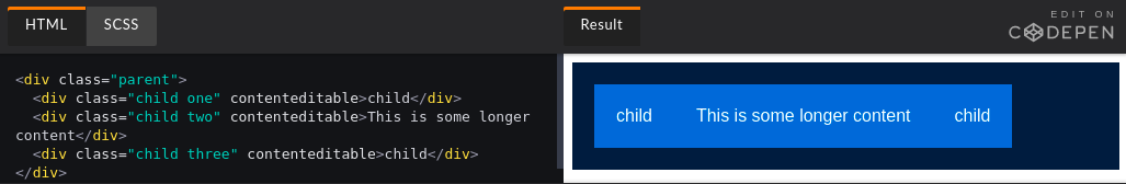 Chúng ta chẳng cần quan tâm đến phần tử con hay style nào đang được áp dụng cho chúng, và điều đó thật tuyệt! Trong trường hợp này, chúng ta đang sắp xếp các mục con cạnh nhau và xếp nó cách đều. Hai dòng CSS trên cung cấp rất nhiều sức mạnh lại cực kì gọn gàng, chúng ta không nhất thiết phải hiểu sự phức tạp bên dưới khi sử dụng nó.