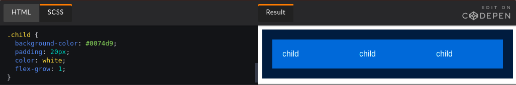 Ở đây mình chỉ cần viết flex-grow: 1 vì các giá trị khác đã được set mặc định khi mình thêm display: flex cho phần tử cha. Giờ nếu muốn 1 phần tử con lớn hơn các phần tử còn lại