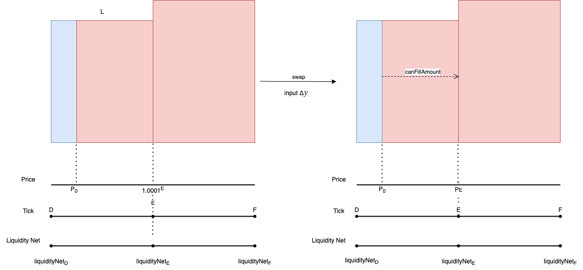 Nhớ lại bài 1, khi price cross qua E, đi vào E-F thì lúc này L sau khi addDelta(liqidityNet_E) chắc chắn phải bằng 0. Chúng ta sẽ có 2 loop ở đây là loop2, loop3 với L = 0 => do đó amountRemainning đi vào rồi đi ra hàm computeSwapStep() sẽ được giữ nguyên và không có lượng output token nào được ghi nhận cho user ở 2 loop này.