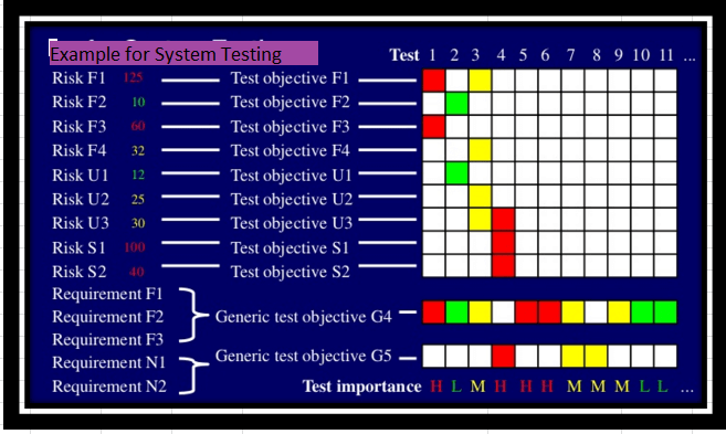- Maintain traceability giữa các đối tượng rủi ro, test bao phủ chúng, kết quả của quá trình kiểm thử đó và các lỗi được tìm thấy trong quá trình test. Tất cả các chiến lược thử nghiệm được thực hiện đúng sẽ làm giảm rủi ro chất lượng.
