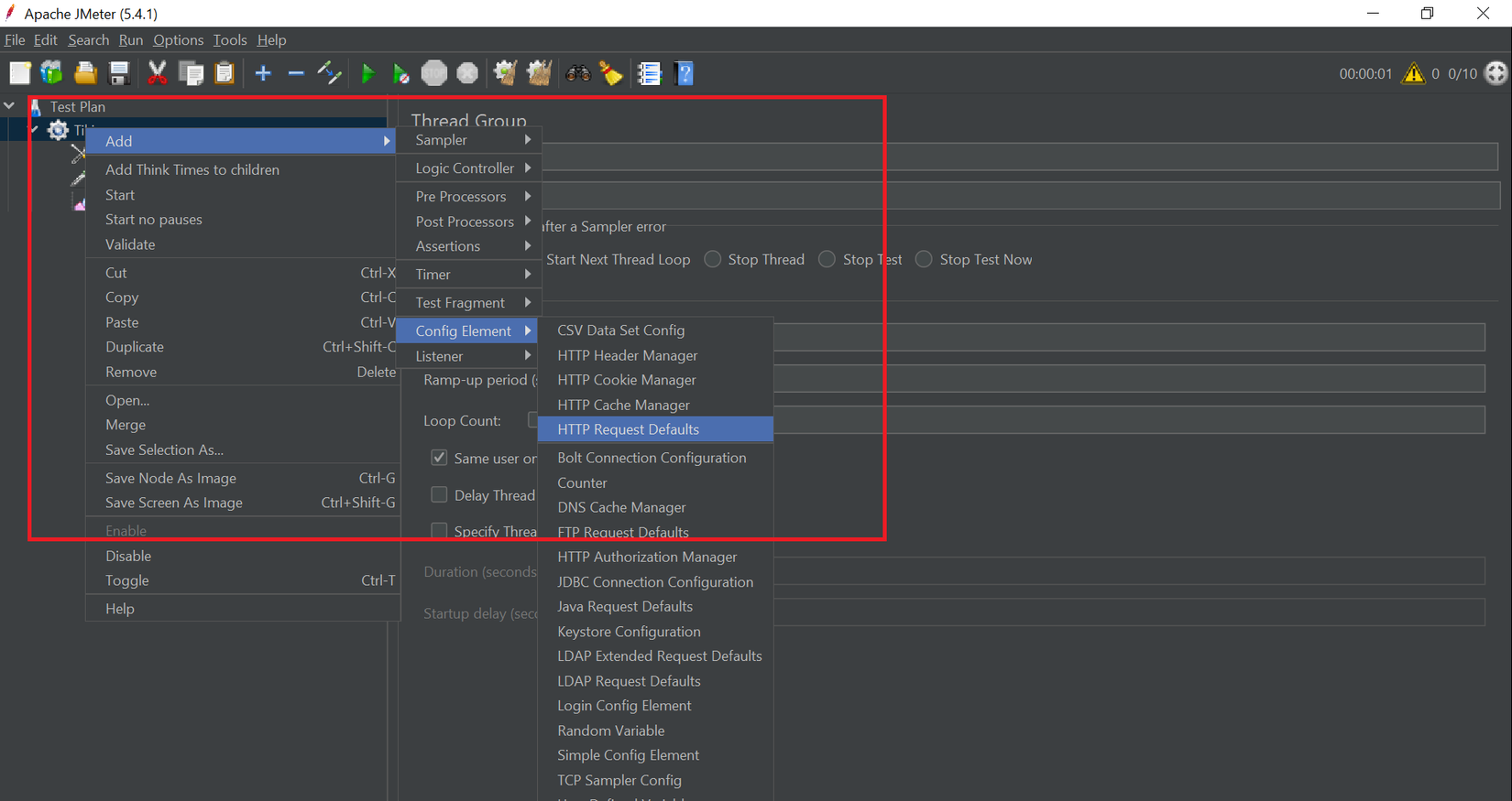 - HTTP Request Defaults : Click Thread group >> Add >> Config Element >> HTTP Request Defaults.