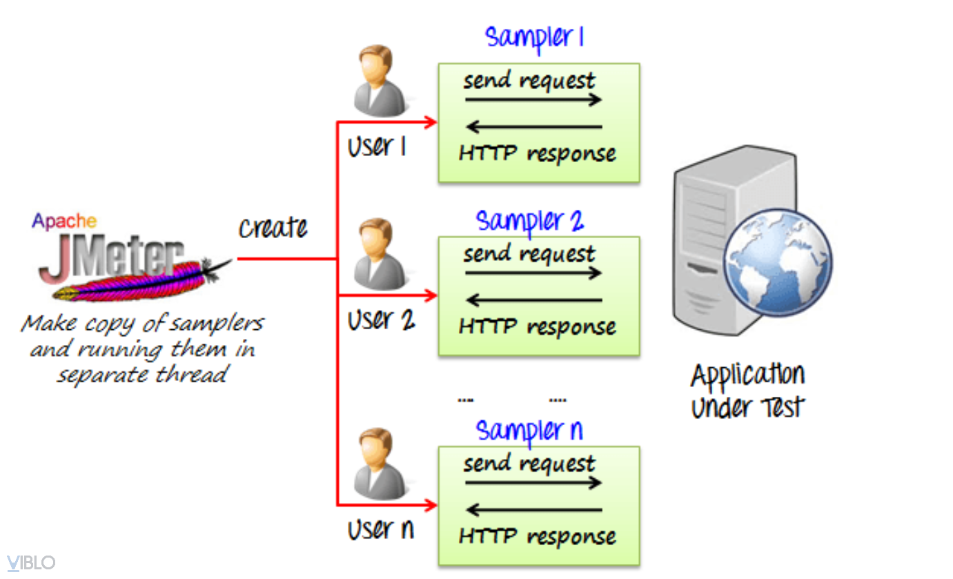 - JMeter mô phỏng một nhóm người dùng, gửi yêu cầu đến máy chủ đích và trả về thông tin thống kê của máy chủ.
