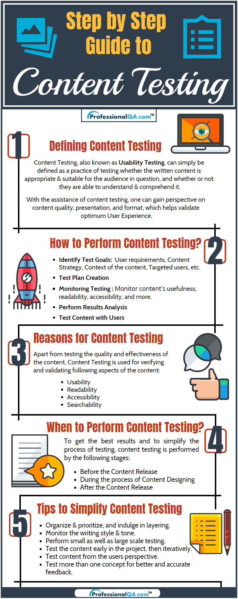Vì nội dung là một phần quan trọng của sự hiểu biết, học hỏi và tìm hiểu các dịch vụ và sản phẩm được cung cấp bởi một tổ chức, điều cực kỳ cần thiết là họ phải kiểm tra nó đúng cách. Với sự hỗ trợ của content testing, người ta có thể có được quan điểm về chất lượng nội dung, trình bày và định dạng.