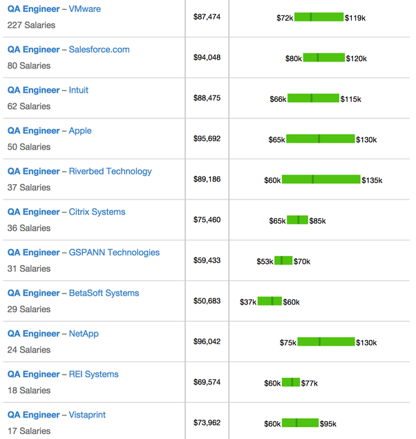Khi bạn nhận một công việc kiểm thử viên phần mềm, tùy theo công ty hoặc tổ chức bạn làm việc, hoặc là kinh nghiệm hay kĩ năng của bạn, bạn sẽ nhận được một mức thù lao khác nhau. Trung bình ở Mỹ, một kiểm thử viên có thể nhận được từ 45,993 đến 74,935 đô la hàng năm, còn ở Ấn Độ con số này là 247,315 đến 449,111 Rupee. Ở Việt Nam, con số này là khoảng 100 đến 250 triệu đồng/năm. Bạn có thể tham khảo thêm mức lương của nghề kiểm thử viên tại một số công ty phần mềm phổ biến sau: