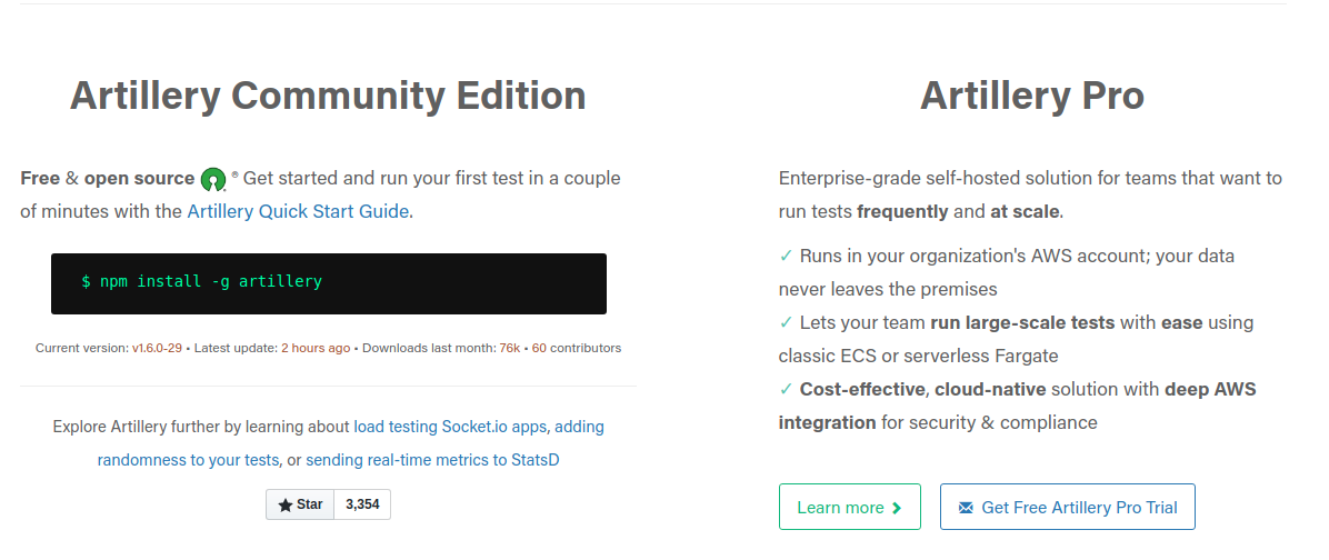 Trước khi đi vào tìm hiểu về cách sử dụng Artillery thì mình cũng giới thiệu luôn là nó gồm 2 phiên bản, 1 là bản Community Edition (miễn phí) và bản Pro (thu phí). Và trong phạm vi nghiên cứu tìm hiểu, sử dụng cá nhân thì chúng ta sẽ sử dụng bản miễn phí nhé, còn bạn nào có điều kiện hoặc làm theo team có thể thử bản thu phí (chi phí là khoảng > $199/tháng)