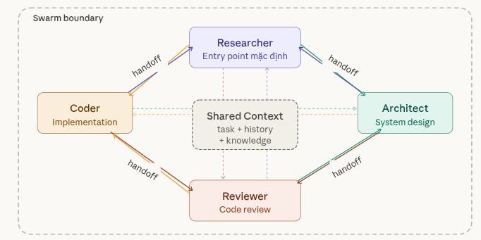 - Ngược lại với cấu trúc phân cấp, Swarm là một hệ thống điều phối cộng tác, nơi nhiều tác vụ làm việc cùng nhau như một đội ngũ để giải quyết vấn đề mà không cần một sự kiểm soát trung tâm tuyệt đối — bất kỳ agent nào cũng có thể gọi bất kỳ agent nào khác