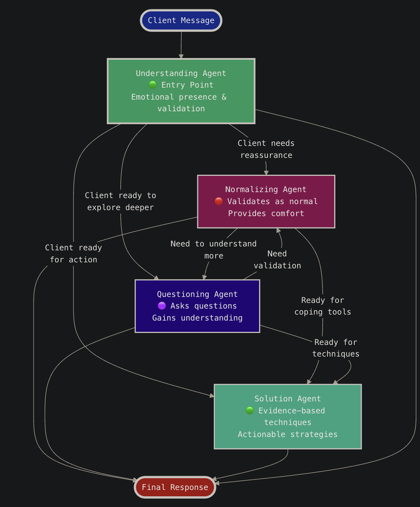 - Vậy vấn đề ở đây là nếu gặp phải một câu input có 2 ý vừa là tự trách bản thân vừa là đang âm thầm chịu đựng thì Orchestrator Agent sẽ chỉ chọn 1 Agent tool là Normalizing hoặc Recognition lúc này bài toán của mình sẽ bị sai và không còn tính đúng đắn trong y khoa. Hơn nữa một bác sĩ tâm lý là phải kết hợp các kĩ thuật khác nhau để trả lời bệnh nhân mới cho kết quả tối nhất. Lúc này Swarm chính là cứu cánh cho bài toán của mình, mình cần một Chatbot có nhiều góc nhìn/chuyên môn và Cần tổng hợp thông tin từ các agent khác nhau. Dưới đây là mô hình hoá flow tương tác giữa các Agent technique trị liệu sau khi dùng Swarm, giờ đây các Agent technique trị liệu của mình đã tương tác giao tiếp với nhau rồi cho ra output.