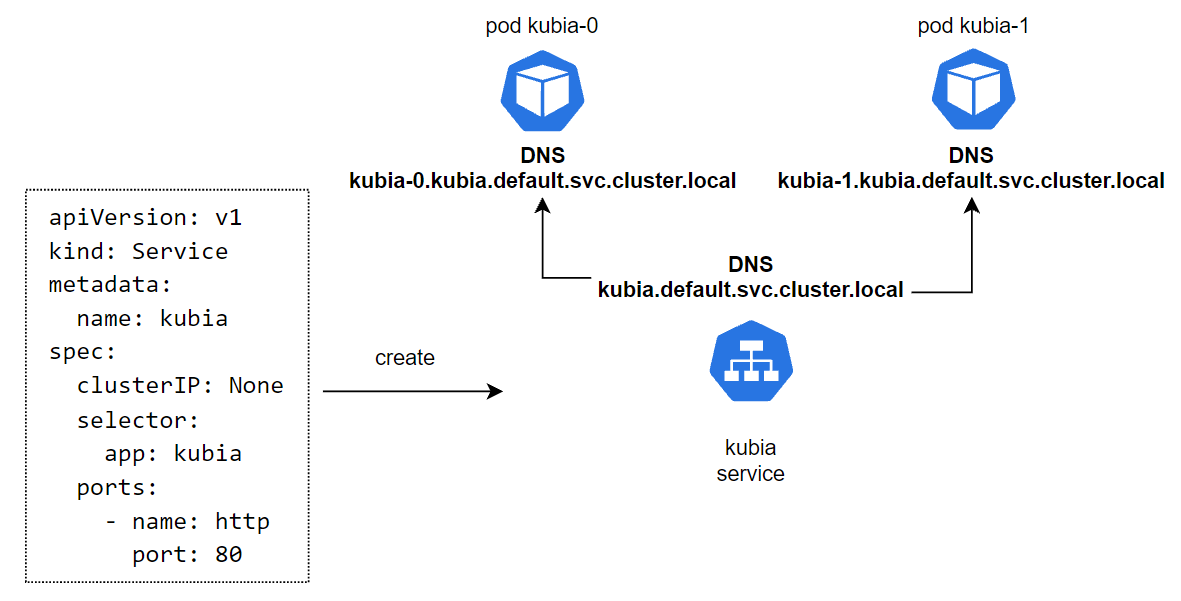 Bằng cách sử dụng Headless Service thì ta có thể tạo Service định danh chính xác cho từng Pod instances.
