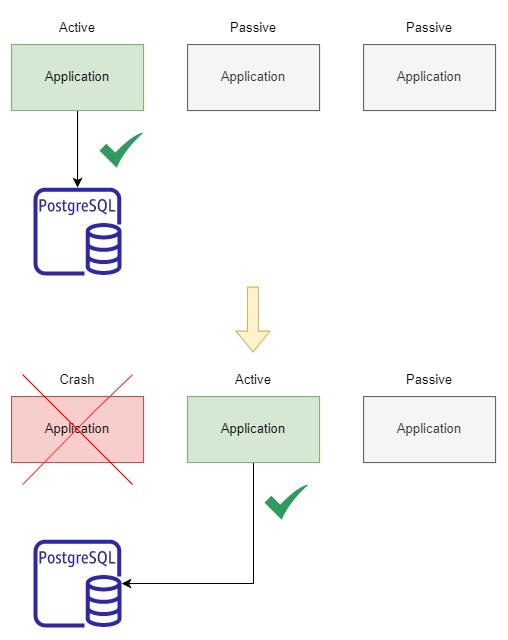 Vì vậy ta phải có cách tạo nhiều Pod mà chỉ có một thằng được active, mấy thằng còn lại thì ở trạng thái passive hết để đảm bảo highly available. Ta làm bằng phương pháp inapplication locking.