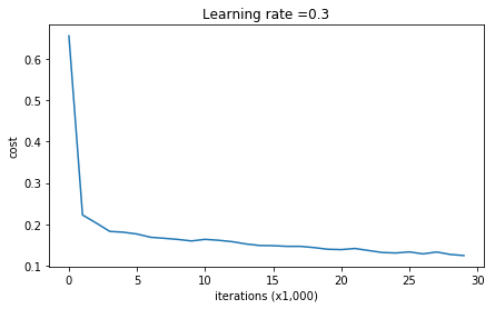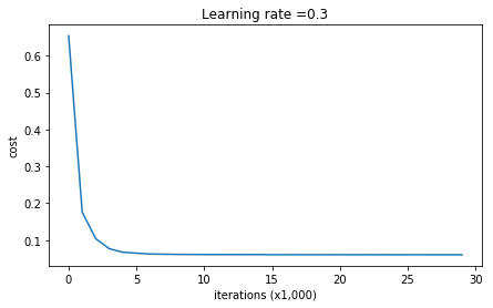 def model(X, Y, learning_rate = 0.3, num_iterations = 30000, print_cost = True):