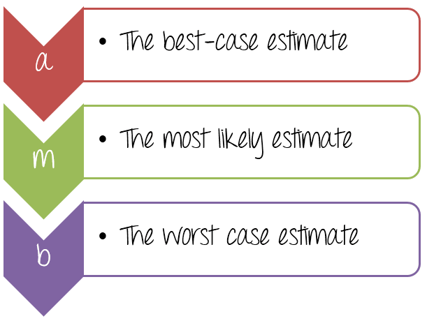 Khi estimate một task, Test Manager cần cung cấp 3 giá trị như đã xác định ở trên. 3 giá trị được xác định là: estimate những gì xảy ra trong** trạng thái tối ưu**, điều gì có khả năng xảy ra cao nhất, hoặc điều gì bạn nghĩ là trường hợp xấu nhất.