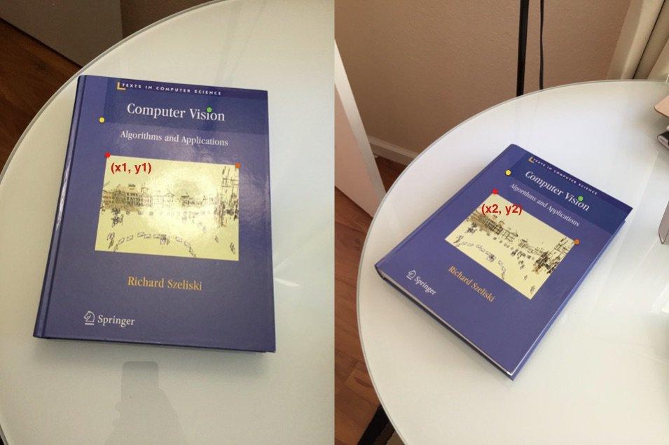 Xét một cặp điểm tương ứng trên 2 hình ảnh cuốn sách ở trên. Ví dụ (x1, y1) trên hình 1 và (x2, y2) trên hình 2 và ta có :