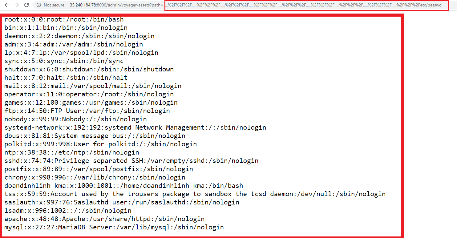 Đoạn mã trên đã cố gắng chống lại “Path traversal” bằng cách xóa đi những chuỗi “../” và “./” nhưng rõ ràng là chưa triệt để. Kẻ tấn công có thể dễ dàng bypass bằng cách sử dụng các chuỗi kí tự “.....%2F%2F%2F”. Từ đó có thể khai thác “Path traversal” và đọc được các tệp tin hệ thống trên máy chủ: